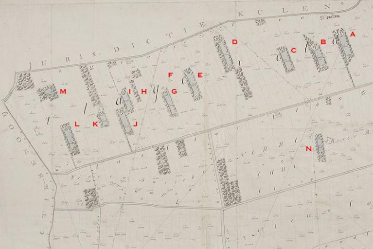Bovenstaand de verpondingskaart van het Beesdsche Lage Veld en Nonnenveld uit 1810. Van de twaalf eendenkooien zijn er 9 bij de eerste opname in 1807 geregistreerd. Op deze kaart geen spoor van Beesd 6 en 14. (Gelders Archief, Arnhem)